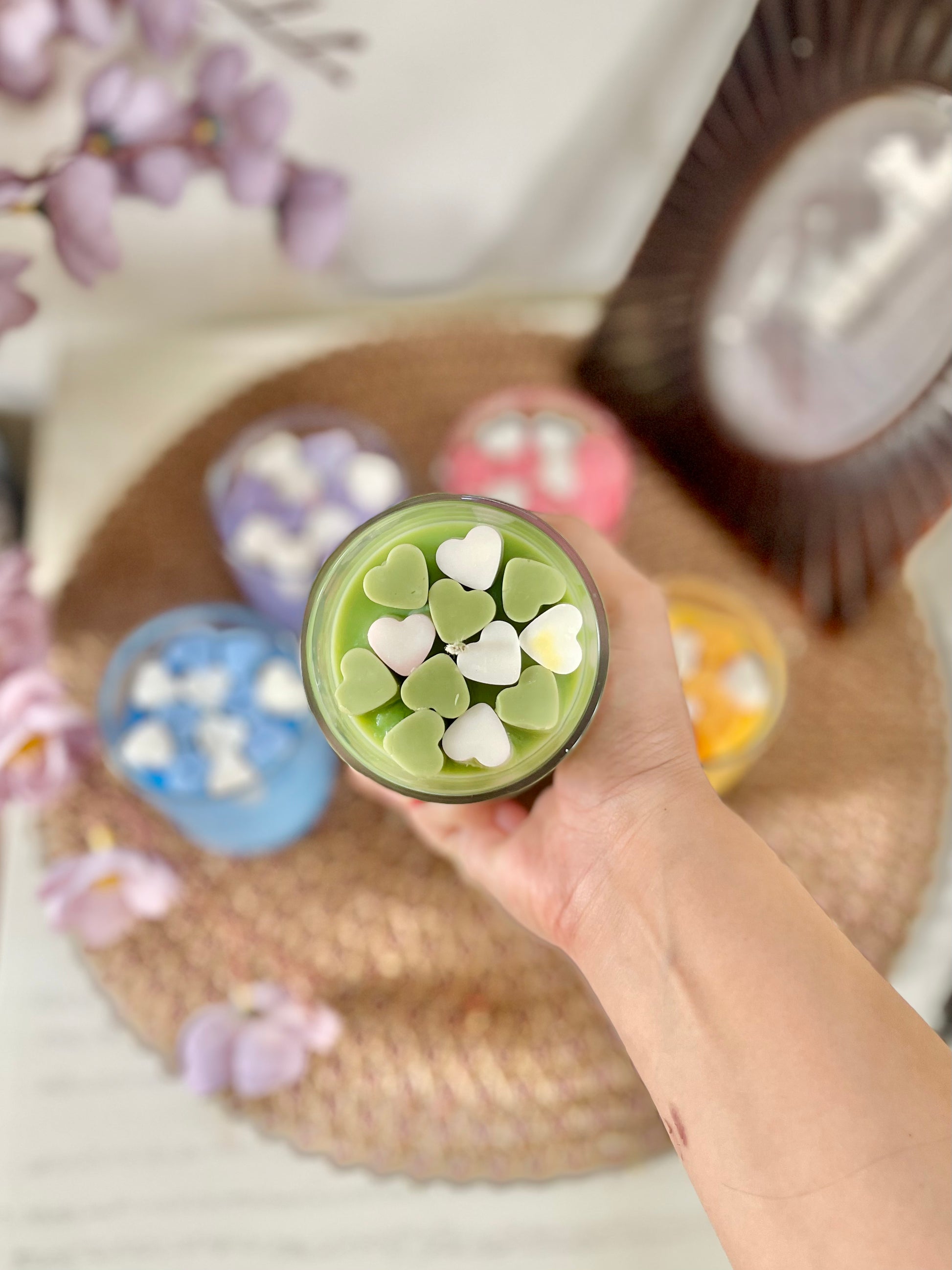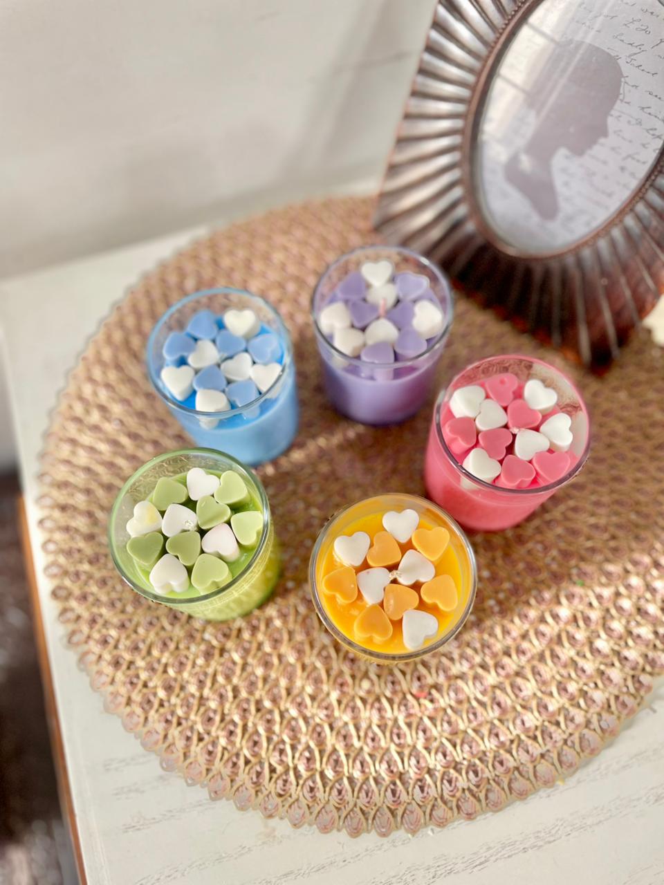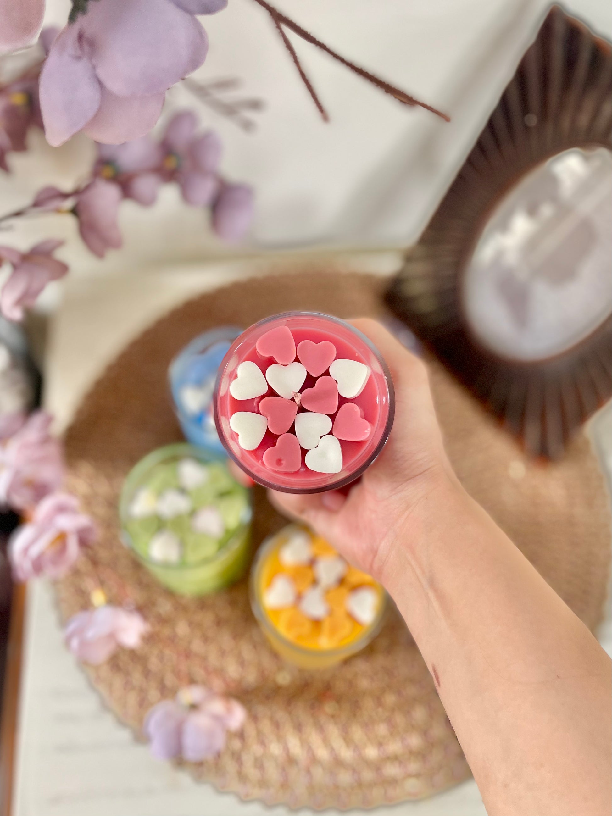 This heart jar candle features coco-soy wax topped with small heart-shaped melts in purple and white and other color combinations. The gentle colors make it look sweet, calm, and cozy. It’s a cute, colorful candle that adds a warm and relaxing touch to any space.