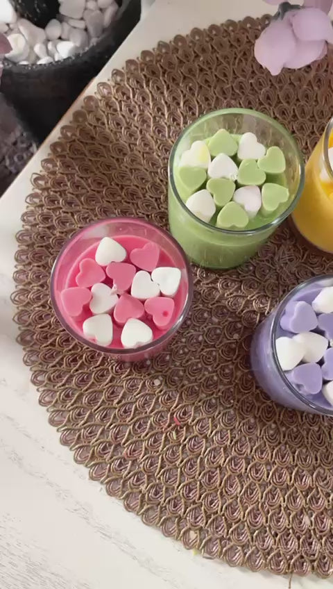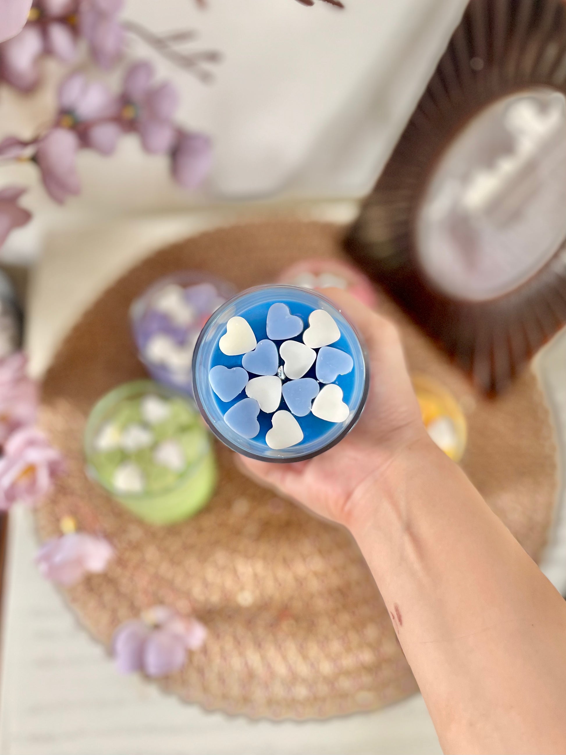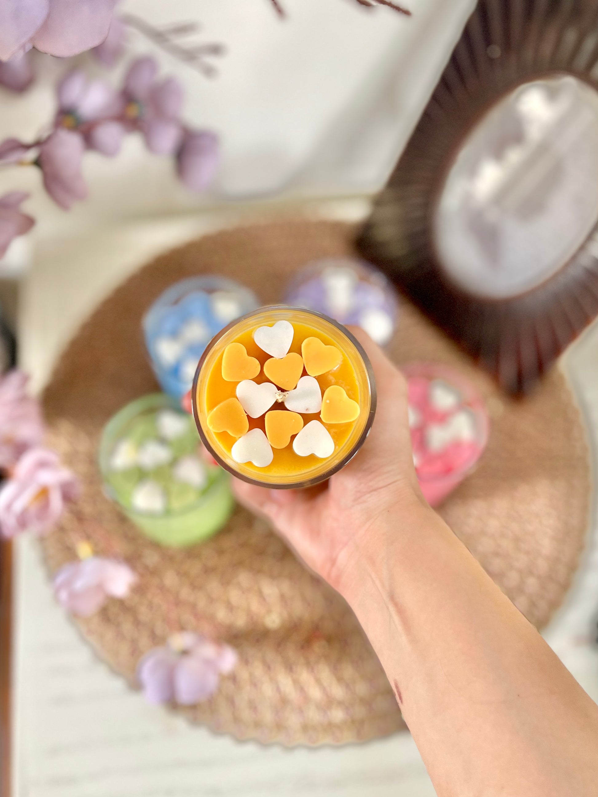 This heart jar candle features coco-soy wax topped with small heart-shaped melts in purple and white and other color combinations. The gentle colors make it look sweet, calm, and cozy. It’s a cute, colorful candle that adds a warm and relaxing touch to any space.