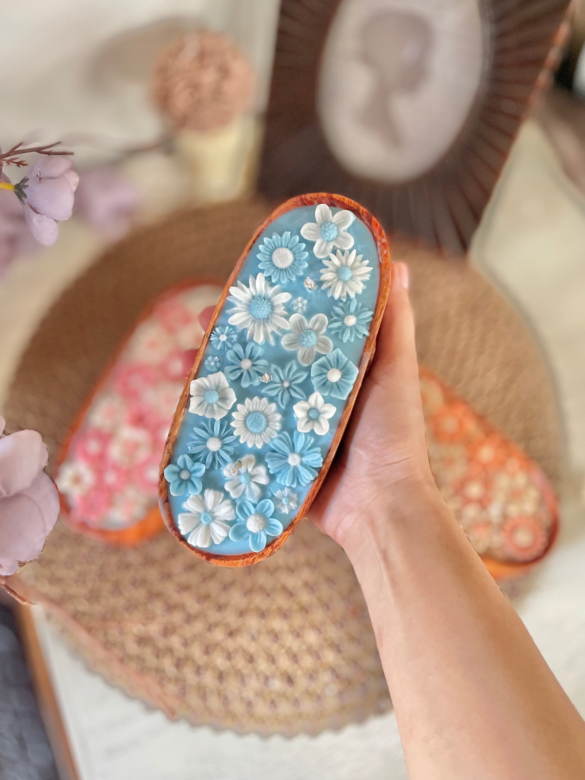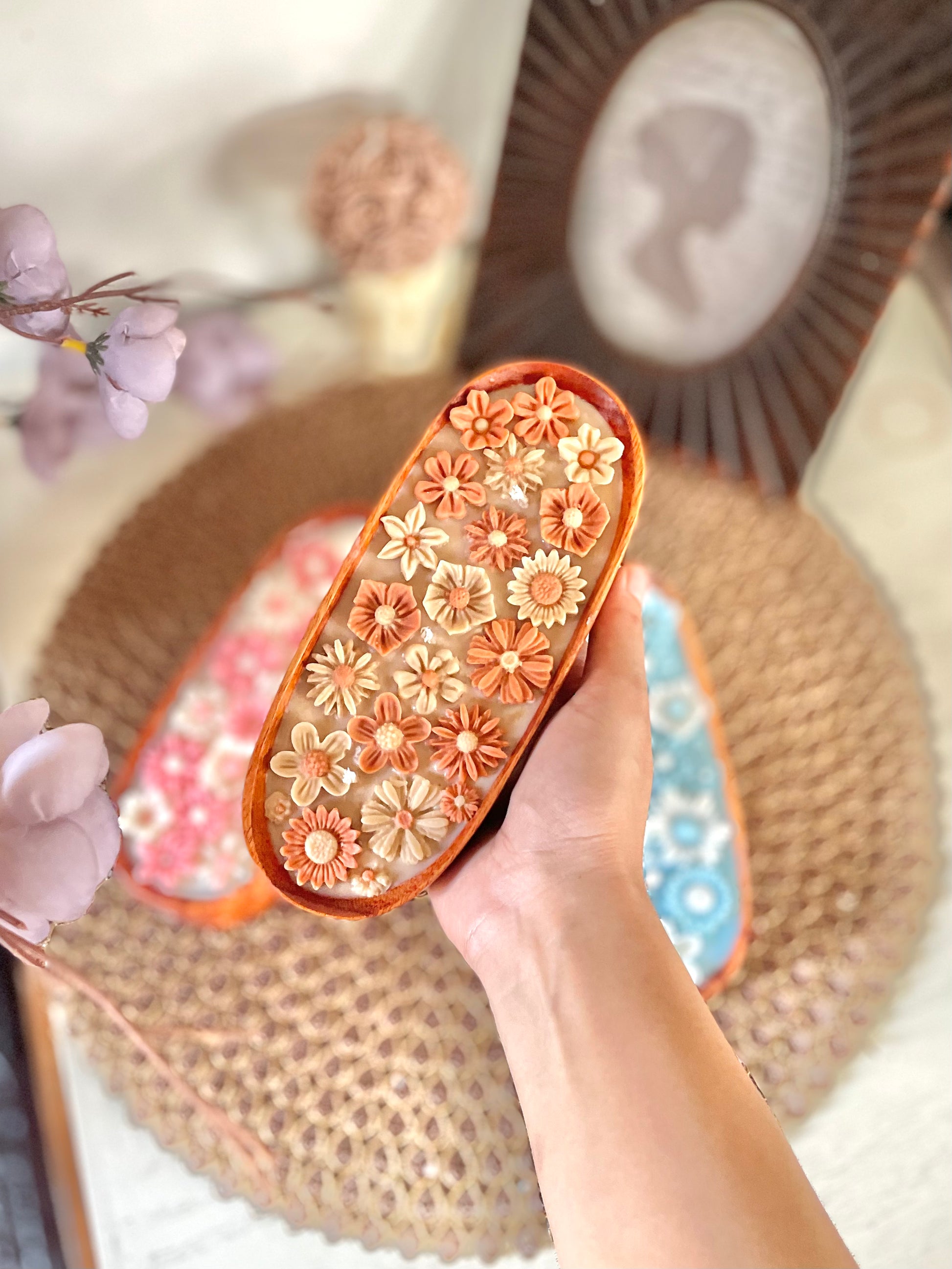 Transform your space with the calming beauty of our Floral wood bowl candle, a stunning blend of artistry and fragrance. This one-of-a-kind candle is poured into an elegant oval tin and adorned with detailed wax flowers. Each bloom is hand-crafted, giving the candle a charming botanical look that elevates any room.